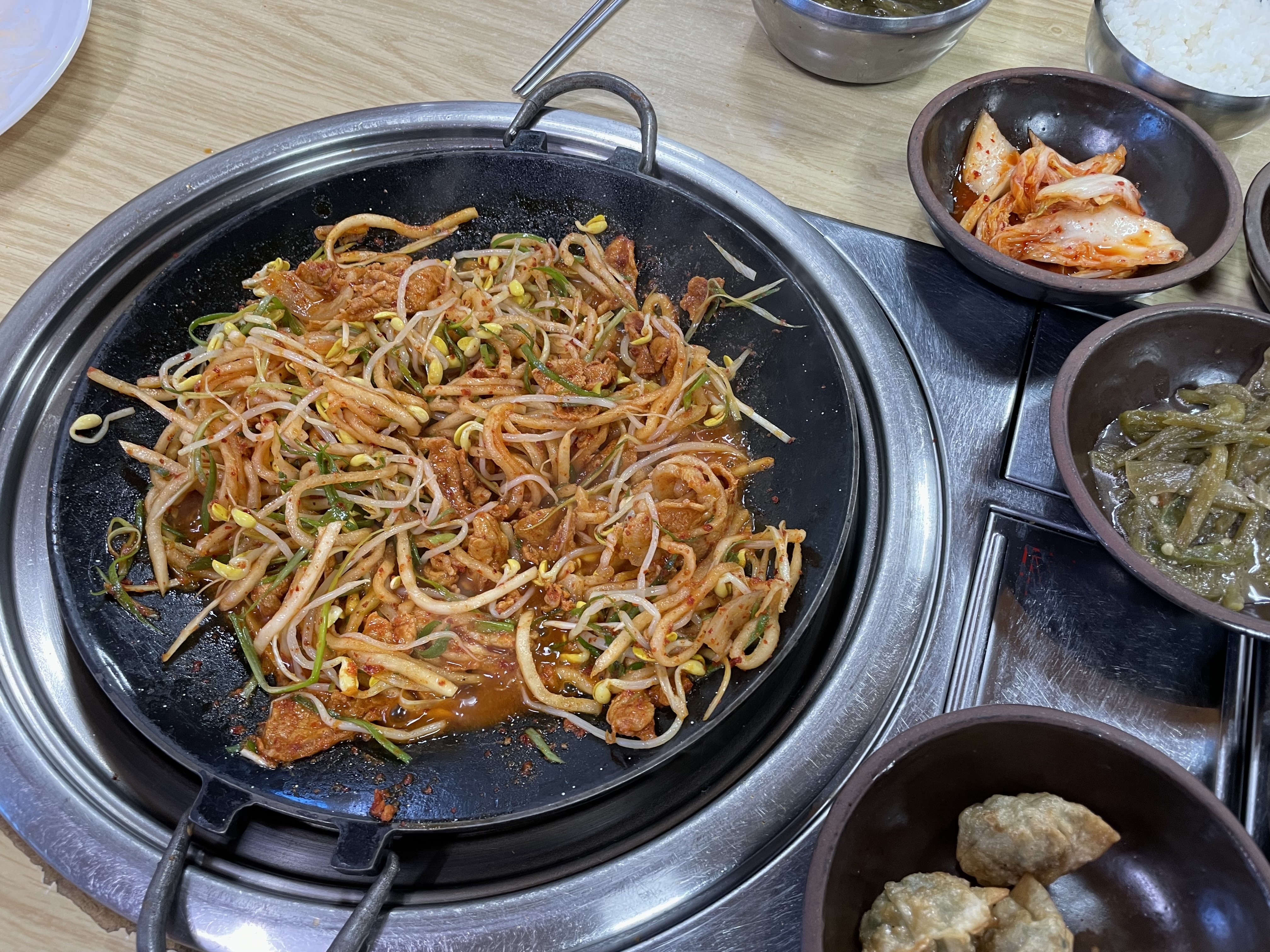 밑반찬과 함께 육수가 자작한 양념된 두루치기 고기가 먼저 나오고~ (고기 양이 두명 먹기에 조금은 부족했어요.)