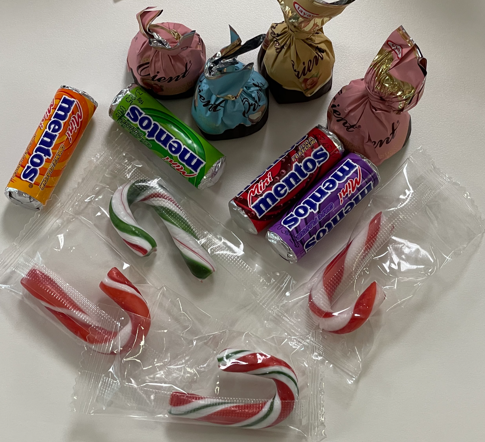 사이즈는 350ml 물병 하나 느낌이고, 트리모양의 통 안에 초콜릿, 사탕, 멘토스 세가지 종류의 간식이 들어있어요!