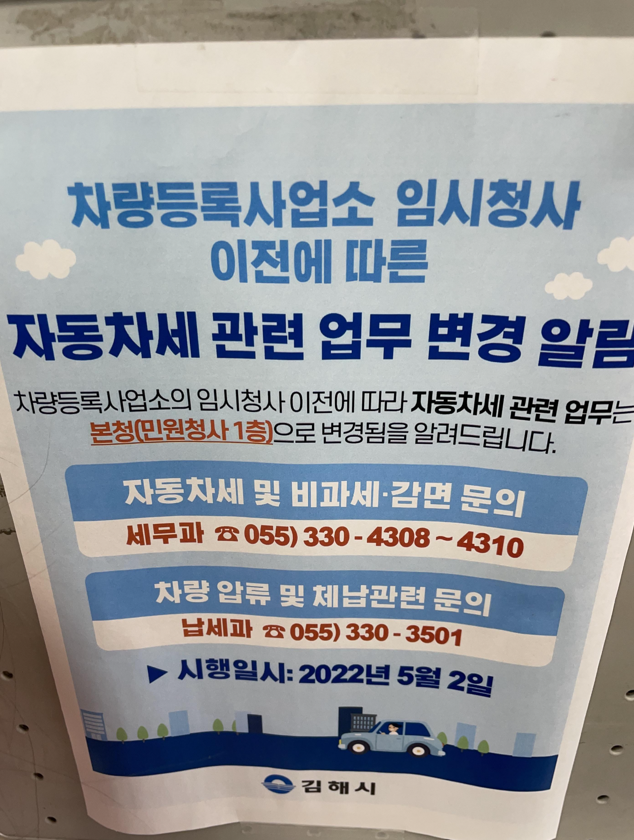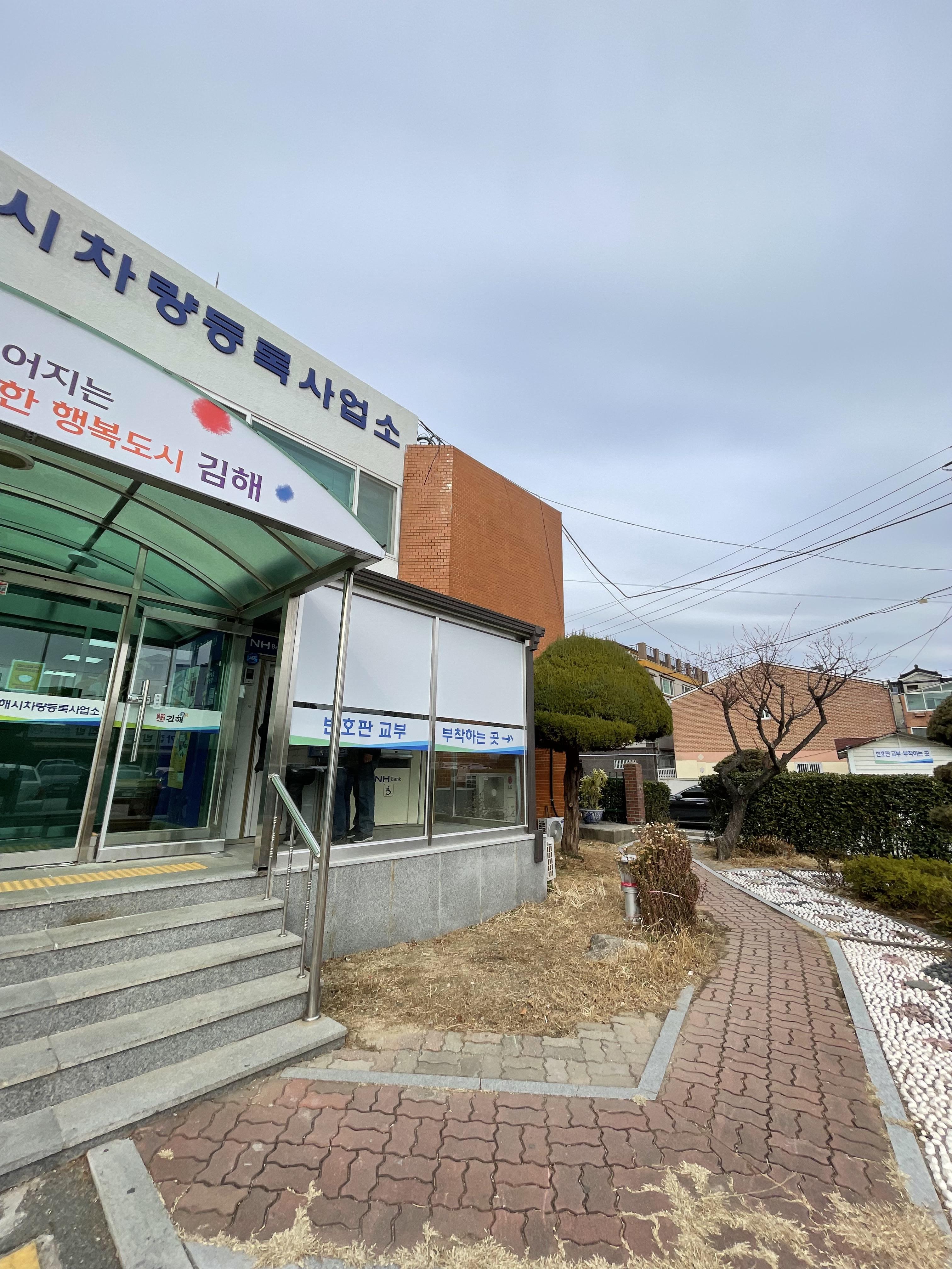 본래 김해시청 부근에 있던 차량등록사업소는 2022년 5월 2일 부터 봉황초 부근 옛 칠산서부동 행전복지센터 건물을 임시청사로 사용하고 있는데요. 본 건물은 2023년 11월경 준공완료를 앞두고 있다고 합니다. 임시 사용중이라 그런지 주차공간이나 대기공간이 다소 협소한 부분이 있었어요!