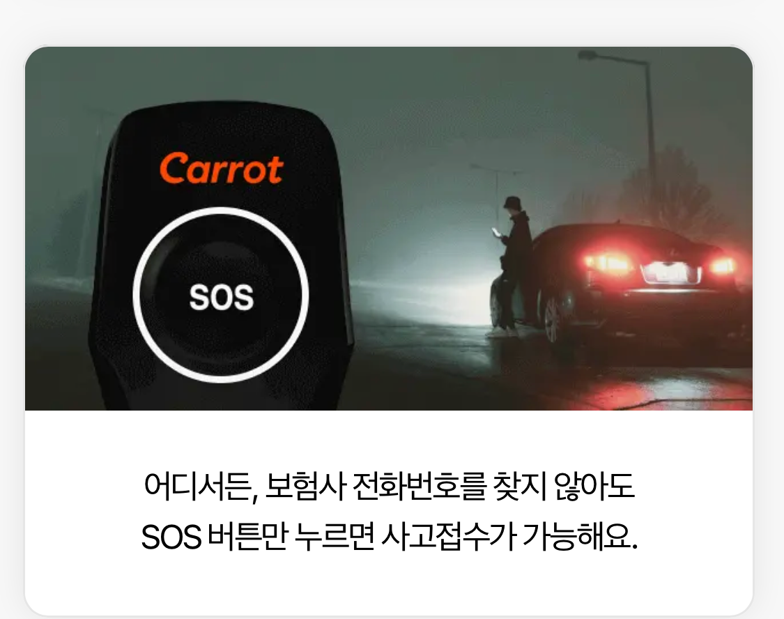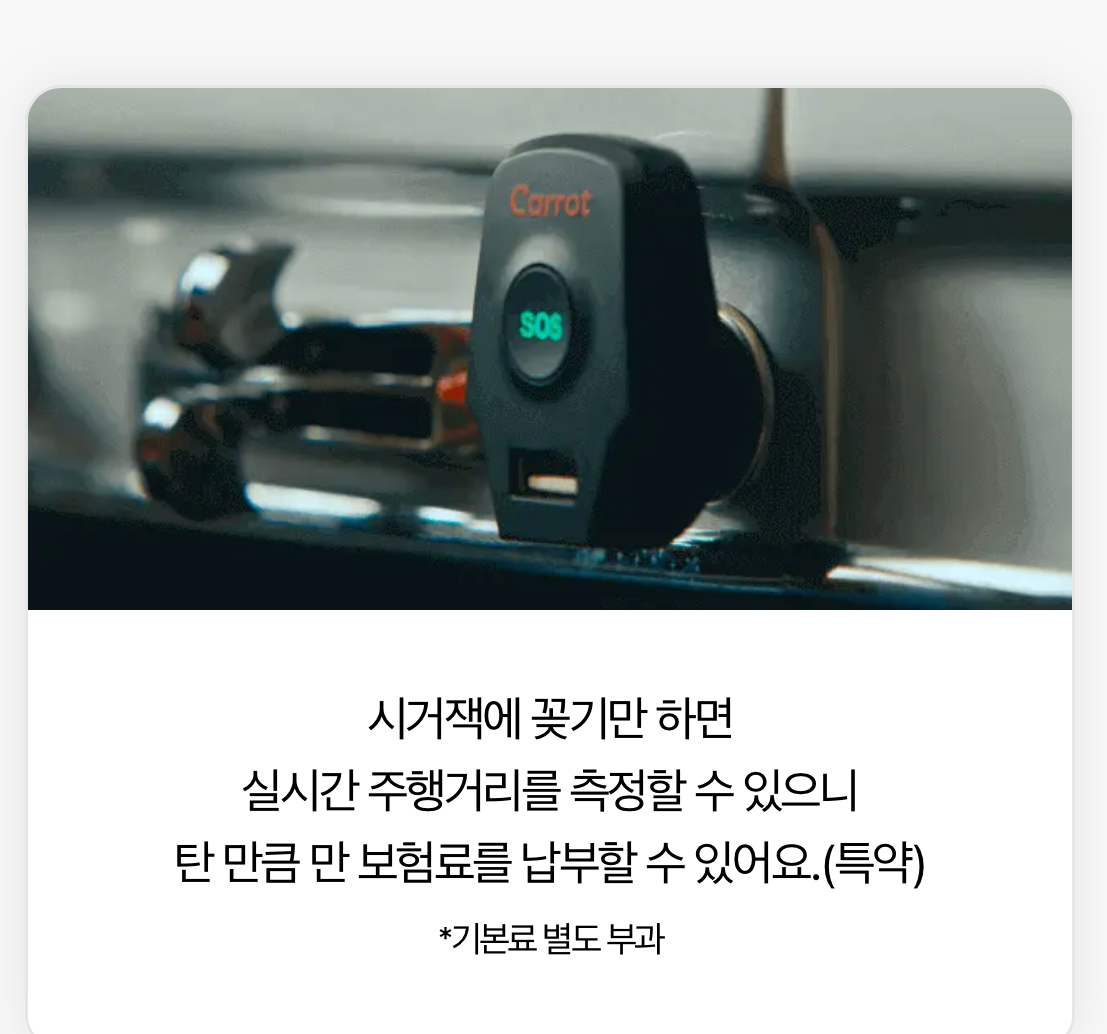 : 월정산형(특약) 가입시 제공되는 GPS단말기로 실시간 주행거리를 측정하고 긴급상황 발생 시 sos버튼을 누르기만 하면 운전자의 안전을 지원받을 수 있습니다.
