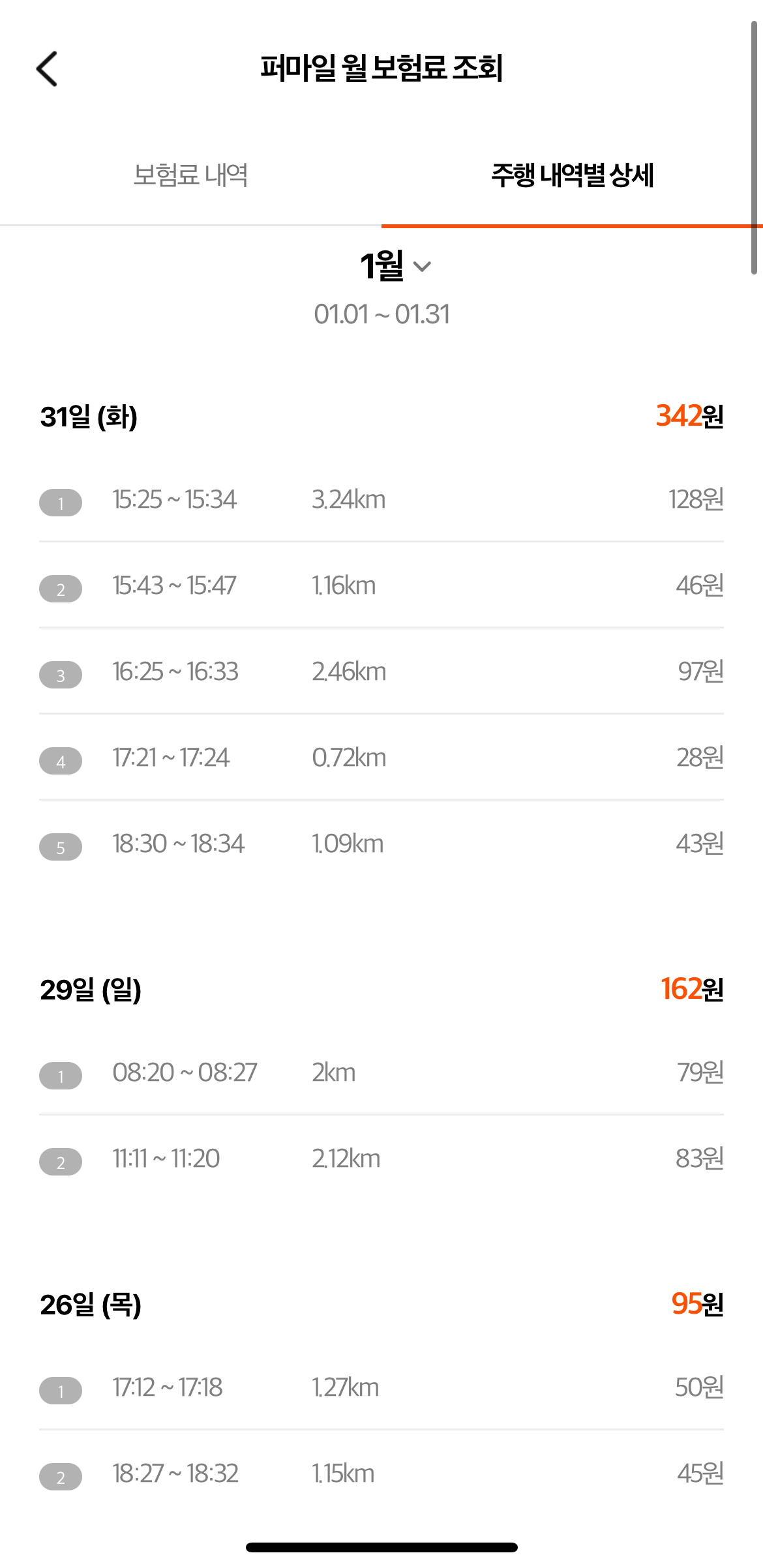 2회 차는 주행거리보험료 + 기본료 (주행거리 124km * 39.38) = 4만 8천 원대