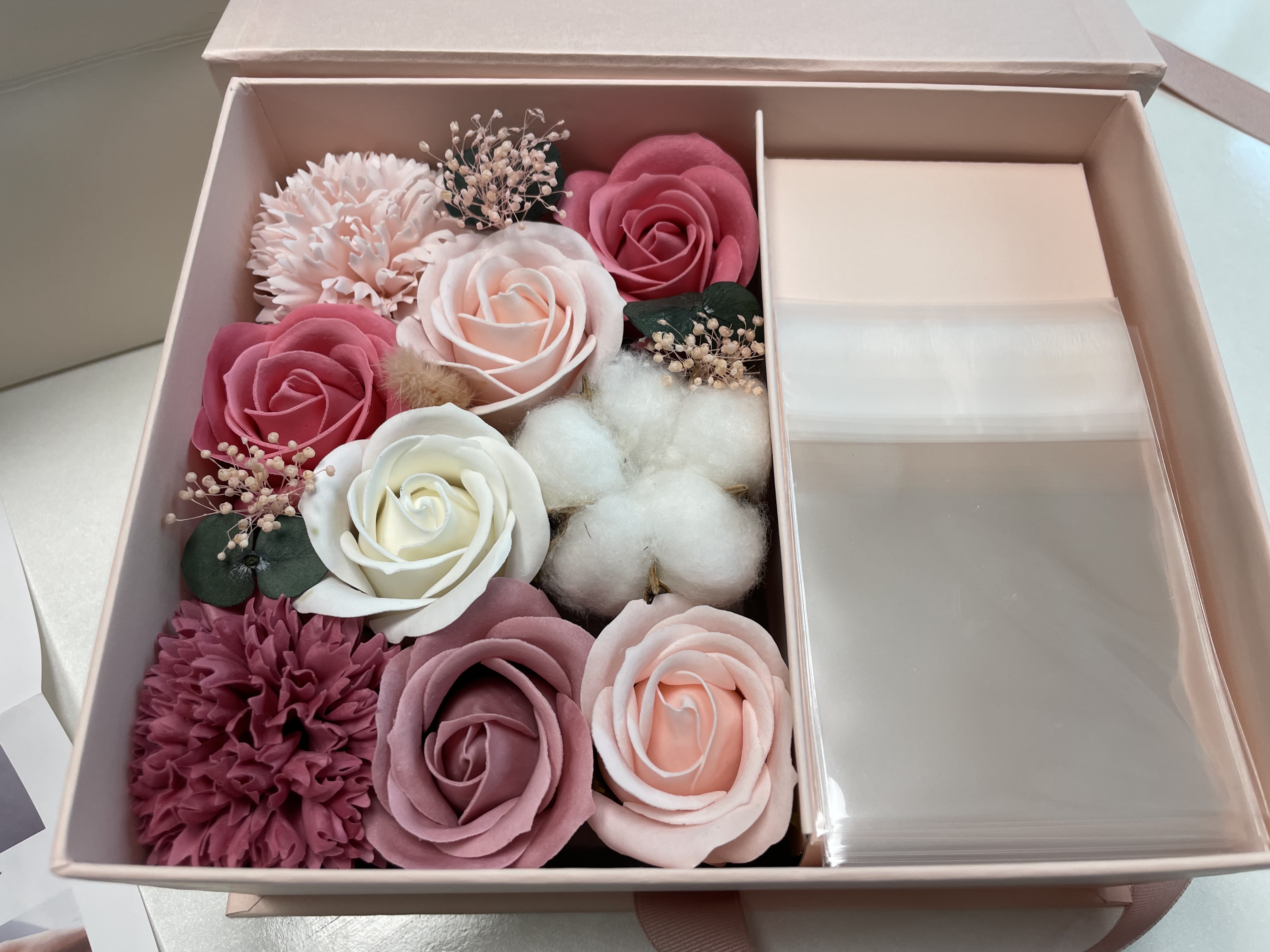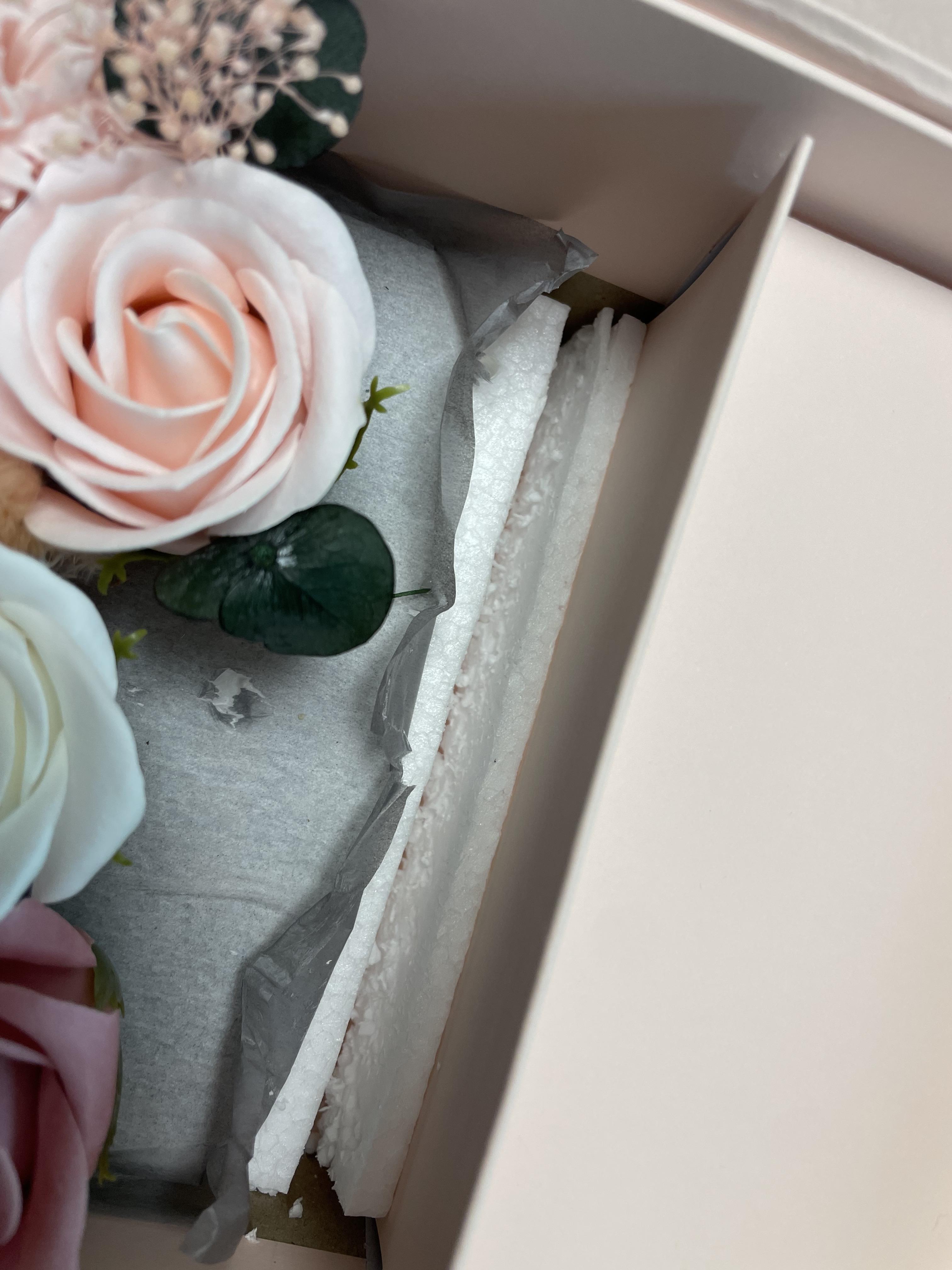 그래도 약간 공간이 모자라서 비누꽃이 꽂혀있는 아랫부분 스티로폼으로 0.5cm 정도 칼로 오려냈어요.