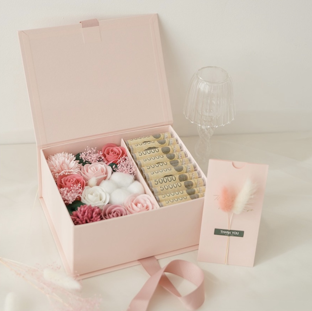 상자의 덮개를 뒤로 넘기면 상자 지지대로 사용하실 수 있어요. 그래서 용돈과 비누꽃이 잘 보이게 둘 수 있는 전시기능도 있으니 생신상에 함께 세팅하면 너무 이쁘겠죠~^^