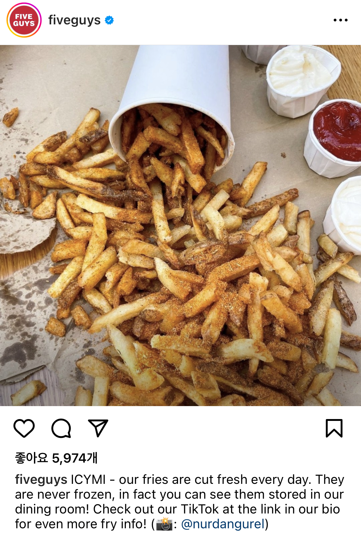 저는 지금도 파이브가이즈 하면 땅콩의 이미지가 떠오르는데요, 뭔가 땅콩기름으로 패티와 감튀를 튀겨서 그런지 건강한 맛이 나는 것 같고, 더 고소한 것 같고.. 맛도 맛이지만, 브랜드 포지셔닝을 할 때 땅콩을 활용해 다른 버거 브랜드와 차별화를 잘한 것 같다는 생각이 듭니다.
